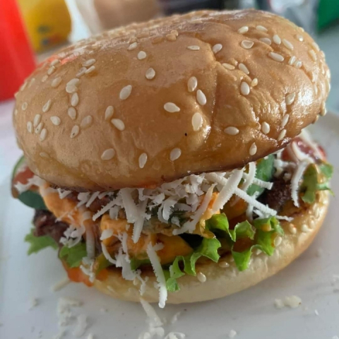 Burger isian sayur, daging sapi, keju parut, dan saus. Rotinya lembut dan rasanya bikin kenyang. Cocok dimakan kapan saja.